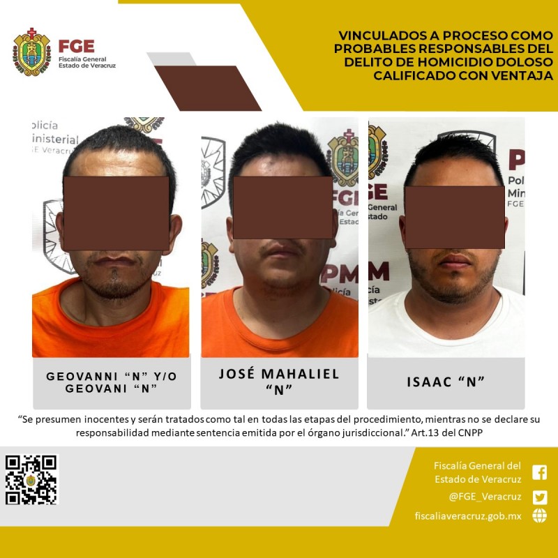 La Fiscalía General del Estado informó que la Fiscalía Regional Xalapa obtuvo vinculación a proceso contra los policías auxiliares del ayuntamiento de Banderilla, José Mahaliel “N”, Geovanni “N” y el comandante Isaac “N”, como probables responsables del delito de homicidio doloso calificado con ventaja.