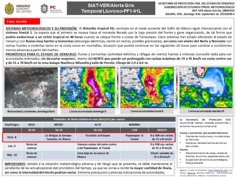 PRONÓSTICO PARA EL ESTADO DE VERACRUZ: lluvias y tormentas (actividad eléctrica y ráfagas de viento) fuertes a intensas (consulte tabla para ver acumulados estimados, sin descartar mayores). Viento del NORTE que puede ser prolongado con rachas máximas de 70 a 95 km/h en costa centro-sur y de 55 a 70 km/h en la zona Xalapa-Naolinco-Misantla y valle de Perote. Oleaje de 2.0 a 4.0 m.