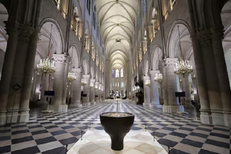 El primer vistazo al nuevo aspecto del interior de Notre Dame de París, restaurado tras el incendio de abril de 2019, reveló una catedral diáfana de muros blanqueados y resplandecientes.