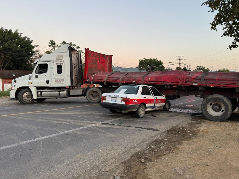 Un grave accidente ocurrió esta mañana, alrededor de las 06:30 a.m., en la carretera federal México-Tuxpan, a la altura de la localidad Ricardo Flores Magón, en el municipio de Tihuatlán. Un tráiler de carga de la empresa Rojos de Rodríguez, identificado como parte del servicio público federal, cerró el paso a un taxi del municipio de Coatzintla, con número económico 542, lo que provocó un fuerte choque.
