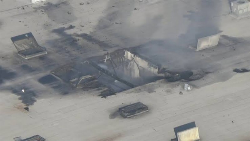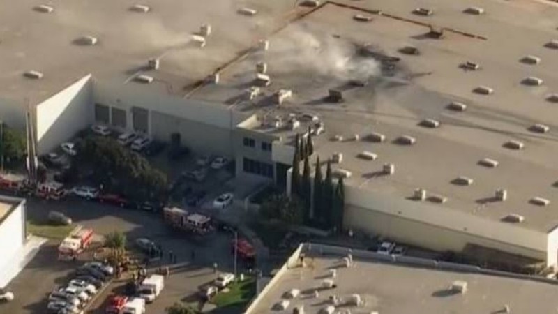 Imágenes difundidas por el canal de televisión KABC-TV puede verse una columna de humo negro saliendo de un agujero en el techo de uno de los varios almacenes del distrito comercial.