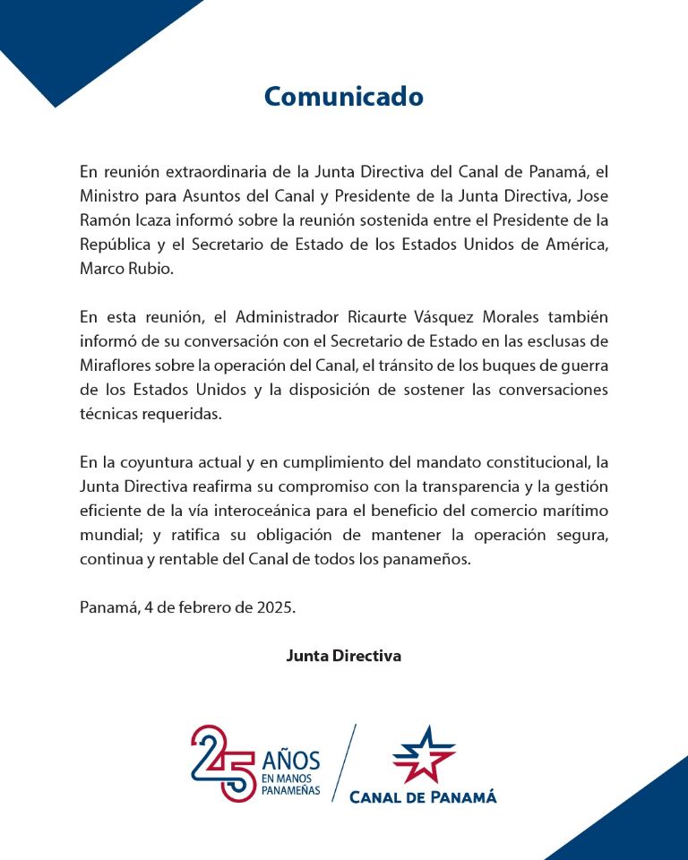 Por su parte, la Autoridad del Canal de Panamá anunció que trabajará con la Marina de Estados Unidos para optimizar la prioridad de tránsito de sus buques en la vía interoceánica, esto después de la visita del secretario de Estado estadounidense, Marco Rubio, como un gesto para aliviar las tensiones generadas por las recientes declaraciones de Donald Trump sobre el control y tarifas del canal.