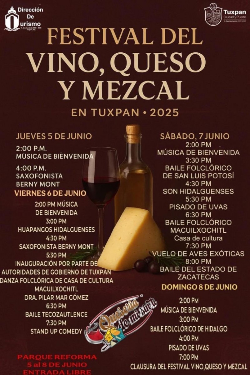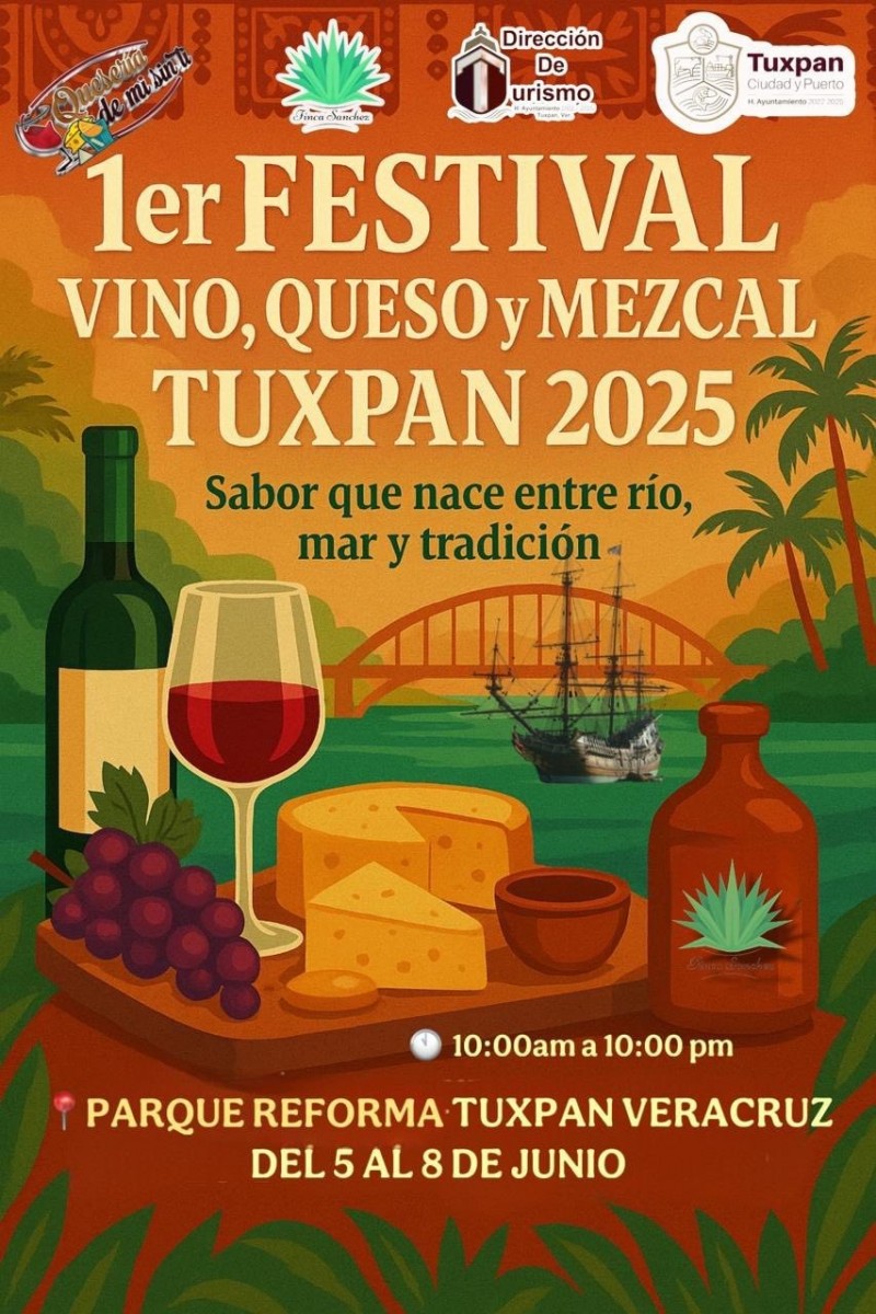 Este jueves 5 de junio inicia en Tuxpan el primer “Festival del Vino, Queso y Mezcal” en el parque Reforma, de 10 de la mañana a 10 de la noche. Habrá diversos eventos artísticos y culturales, además de pisado de uvas.