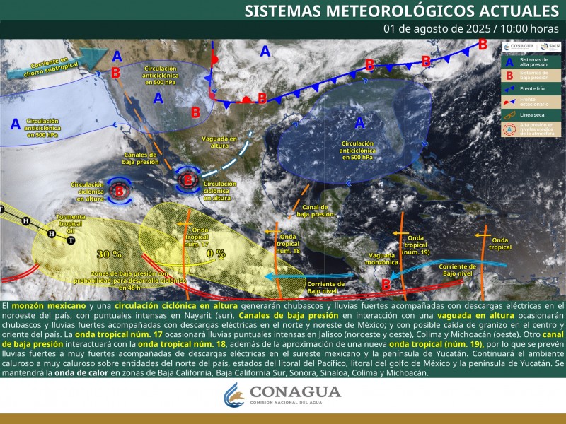 El monzón mexicano aunado a una circulación ciclónica en altura sobre Durango, generarán lluvias puntuales intensas en Sinaloa (norte y centro), lluvias fuertes a muy fuertes en Sonora, Chihuahua, Durango y Nayarit; así como intervalos de chubascos en Baja California Sur.
