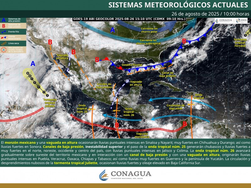 El monzón mexicano en interacción con una circulación ciclónica en niveles medios de la atmósfera en el sur del golfo de California y divergencia, generarán lluvias puntuales intensas en Sonora, Chihuahua y Sinaloa; muy fuertes en Durango; así como lluvias fuertes en Baja California Sur y Nayarit. Todas acompañadas con descargas eléctricas.