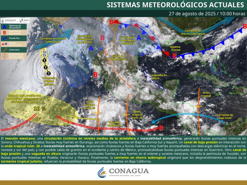 El monzón mexicano en interacción con una circulación ciclónica en niveles medios de la atmósfera sobre Baja California Sur, generarán lluvias fuertes a puntuales muy fuertes con descargas eléctricas en Baja California Sur, Sonora, Chihuahua, Sinaloa, Durango y Nayarit.