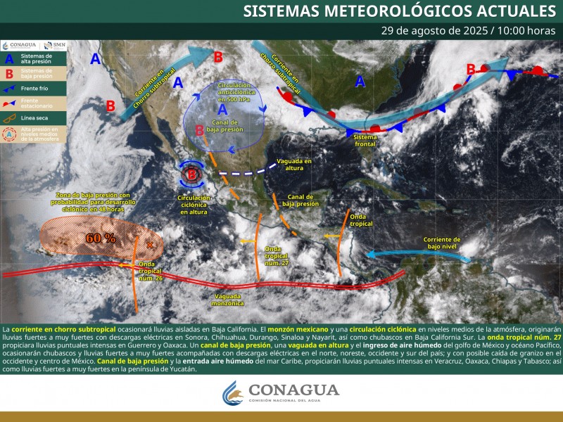 El monzón mexicano, una vaguada en niveles medios de la atmósfera sobre el noroeste del país y divergencia, ocasionarán chubascos y lluvias fuertes a muy fuertes en Baja California Sur, Sonora, Chihuahua, Durango, Sinaloa y Nayarit. Estas lluvias estarán acompañadas con descargas eléctricas.