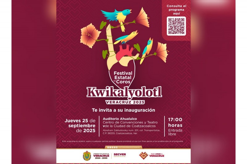 La Secretaría de Cultura de Veracruz (SECVER), a través de la Dirección de Formación y Desarrollo Artístico, invita al público en general al primer Festival Estatal de Coros Kwikalyolotl, del 25 al 28 de este mes en Coatzacoalcos. Las actividades son gratuitas.
