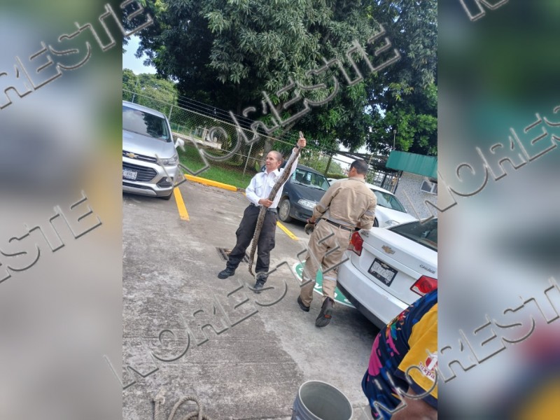 Elementos de Bomberos y Protección Civil arribaron al lugar y, tras varios minutos de maniobras con equipo especializado, lograron retirar al reptil sin causarle lesiones. La serpiente, conocida como mazacuata o boa, tendría una edad aproximada de entre ocho y diez años.