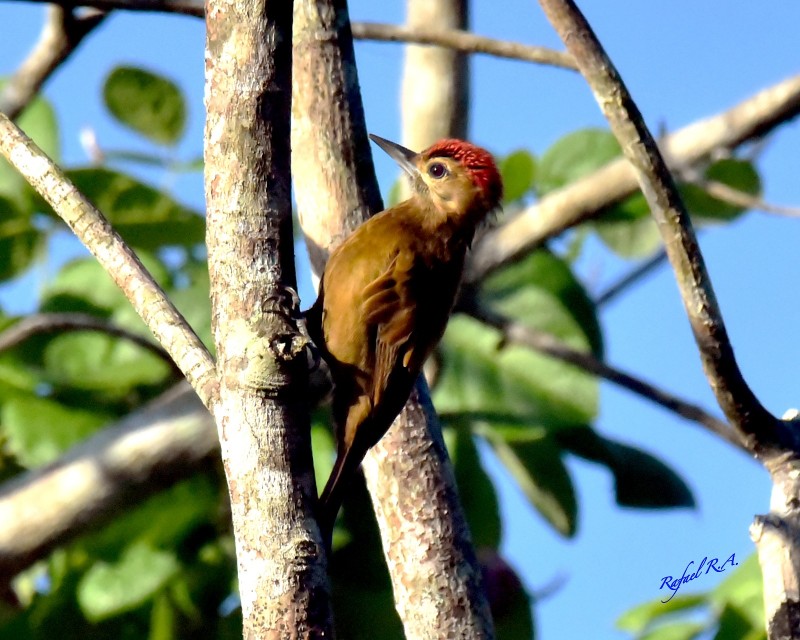 Carpintero café. Su apariencia es muy distintiva de color café ahumado con la cara gris pálida, el macho tiene su corona roja. Esta especie es muy pequeño en referencia a otros carpinteros. Se alimenta a todos los niveles de bosque, primordialmente en ramas pequeñas entre bejucos y lianas.