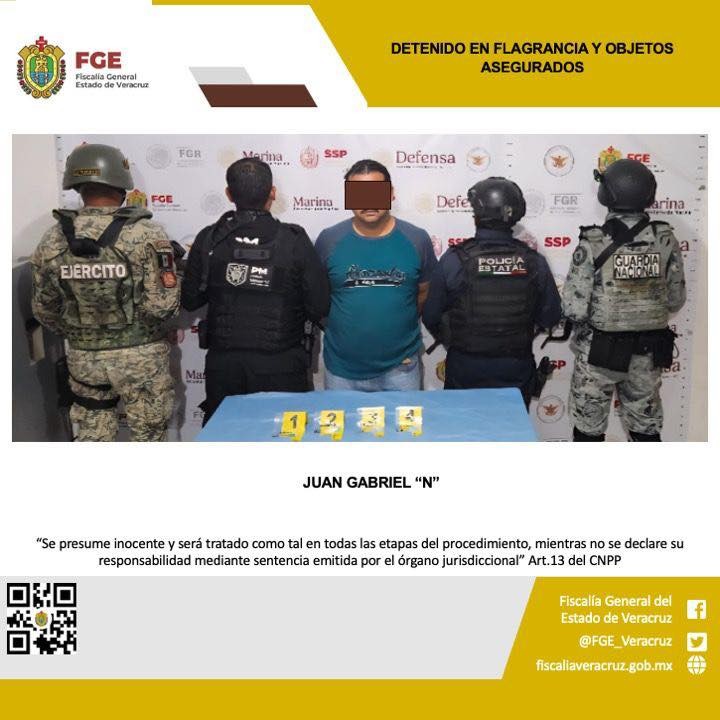 En dicho operativo se detuvo en flagrancia a Juan Gabriel “N”. Asimismo, se aseguraron bolsas que contenían polvo blanco y cristalino con características similares a las de la droga denominada cristal.