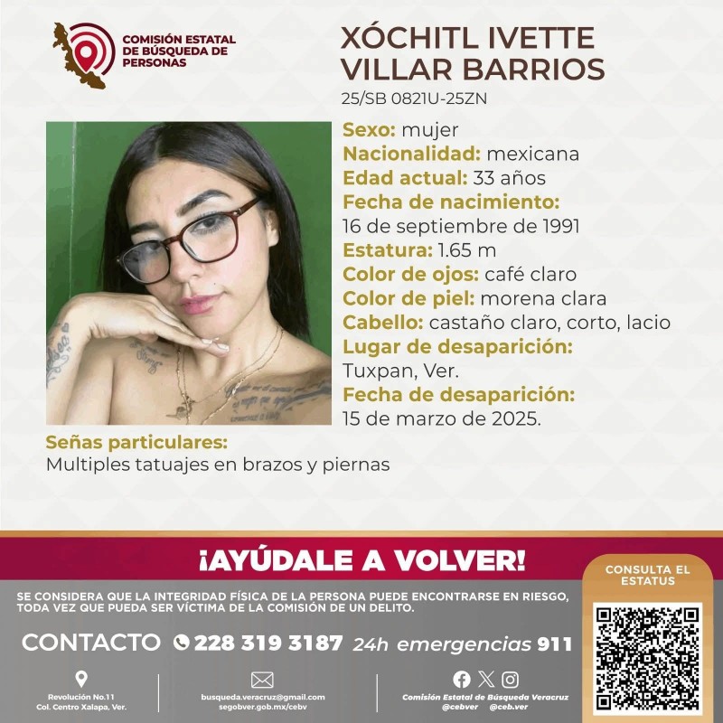 Se trata de Xóchitl Ivette Villar Barrios, de 33 años, vecina de Tuxpan, quien desapareció en marzo de este año y desde entonces era buscada por su familia y colectivos de búsqueda.