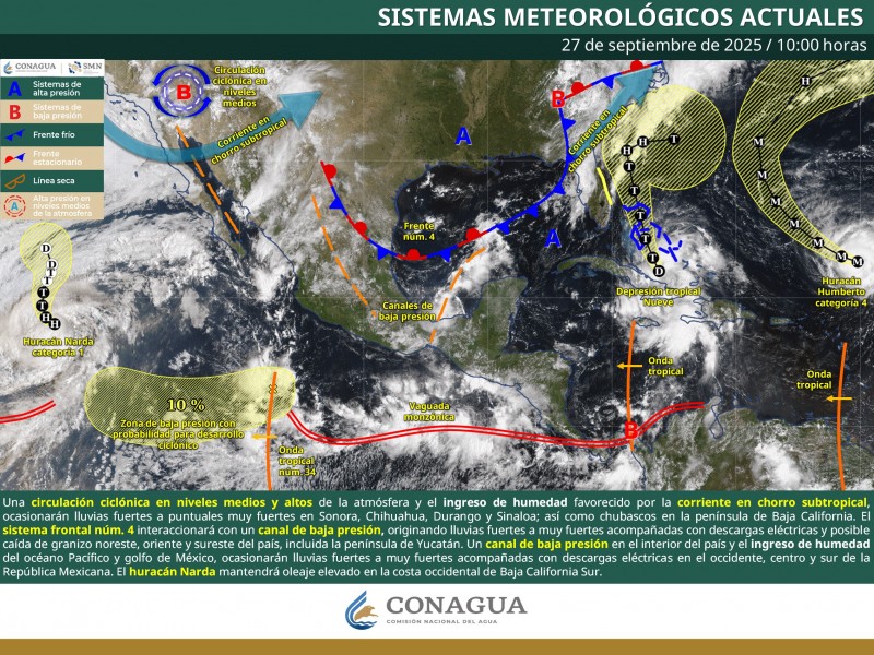 A su vez, el huracán Narda se localizará a más de 1,300 km al oeste-suroeste de Baja California Sur, su circulación mantendrá oleaje elevado en la costa occidental de la península de Baja California.