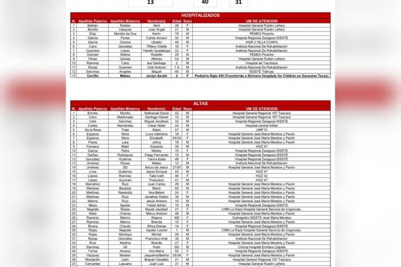 Detalló que permanecen 13 personas hospitalizadas, en tanto que 40 ya fueron dadas de alta.