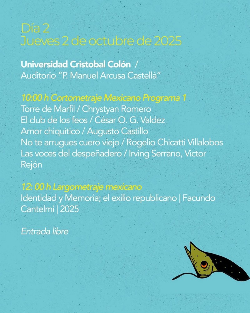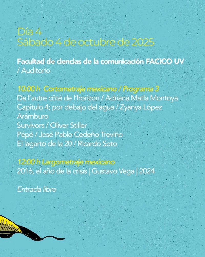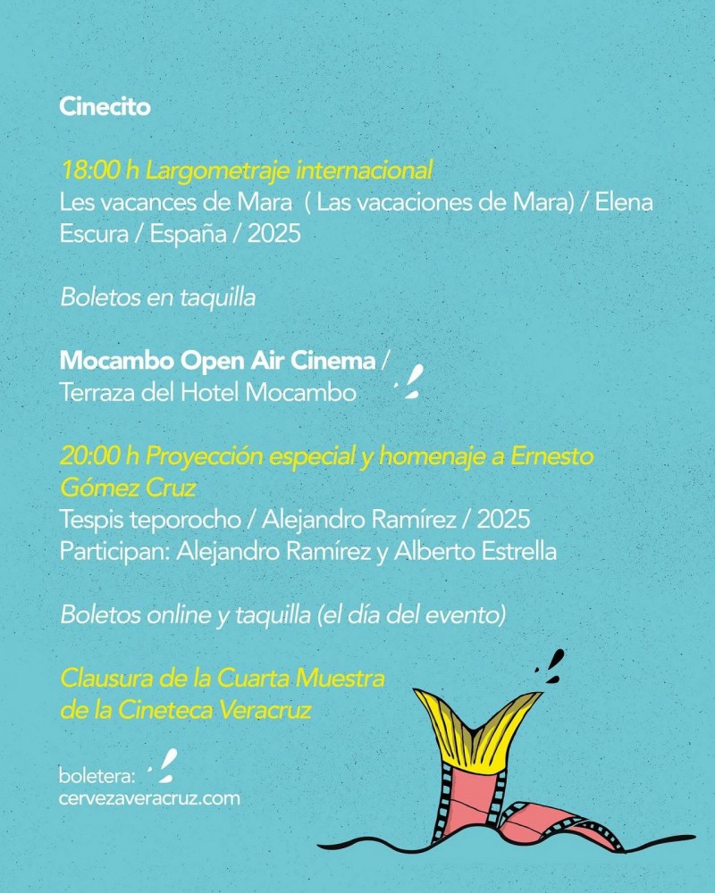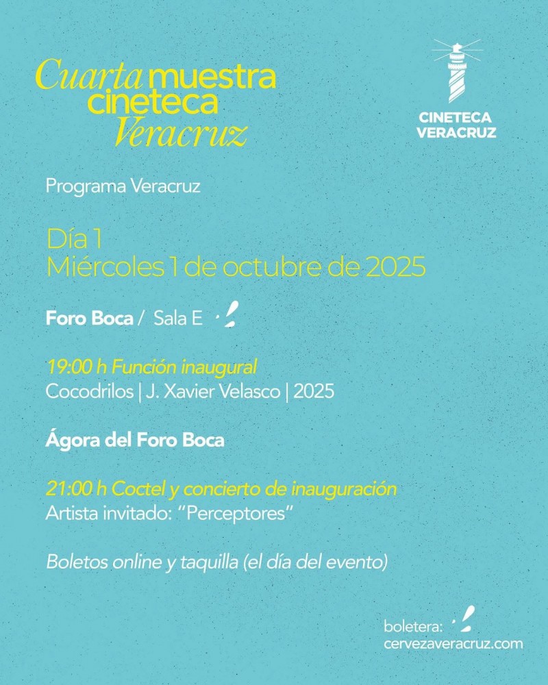 La Muestra se realizará del 1 al 4 de octubre en el Foro Boca y los boletos se pueden adquirir en las redes sociales de la Cineteca Veracruz, para los diversos largometrajes, cortos y documentales que se proyectarán.