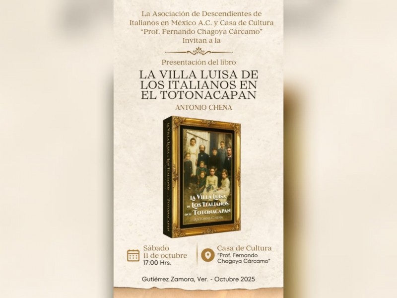 La historia de la migración italiana en el Totonacapan será develada en la presentación del libro "LA VILLA LUISA DE LOS ITALIANOS EN EL TOTONACAPAN", autoría de Antonio Chena.