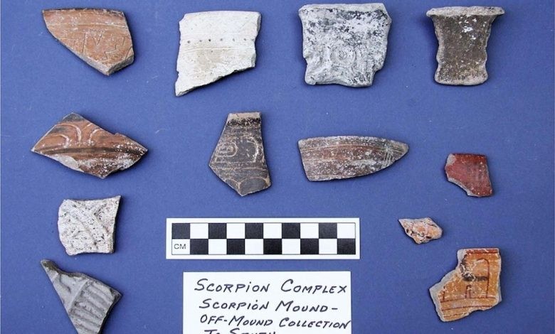 El complejo ceremonial está integrado por 11 montículos, y en la parte superior de la cabeza del escorpión se localizó una ofrenda moderna (dos vasijas trípodes con tabaco y chiles), lo que sugiere que el sitio aún forma parte de las prácticas culturales de la población actual.