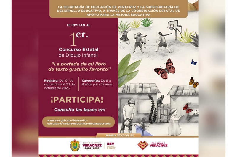 De acuerdo con la convocatoria emitida, podrán participar niños y niñas en categorías de seis a ocho y de nueve a doce años. Las bases están disponibles en https://www.sev.gob.mx/desarrollo-educativo/mejora-educativa/dibujatuportada/.