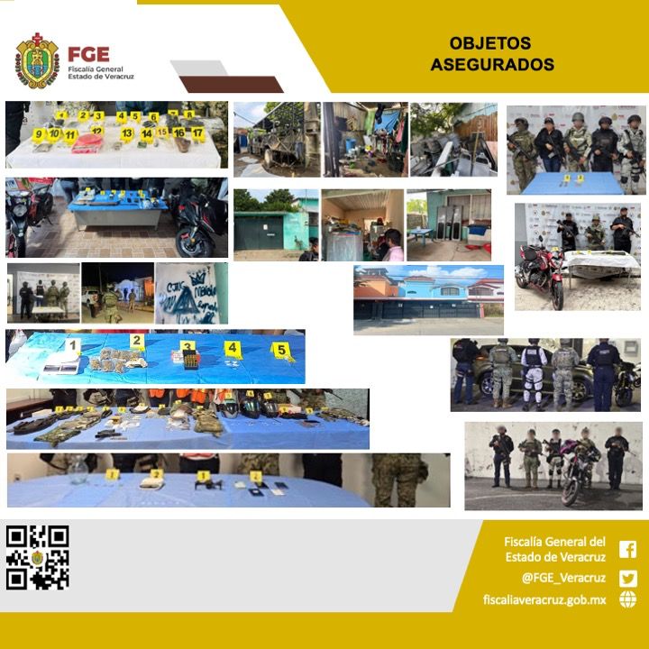 • Resultados: Aseguramiento de porta cargadores, prendas de ropa, una colcha, pasamontañas, bolsas negras, pedazos de vendas y tela, botellas, cinta de emplaye, tarjetas bancarias, armas blancas y una pipa. La Fiscal General reafirma su compromiso de continuar reforzando las acciones en materia de seguridad en todo el territorio estatal, en estrecha colaboración con las fuerzas estatales y federales, para lograr resultados contundentes en el combate a la delincuencia, preservando la paz y el orden en el estado de Veracruz.