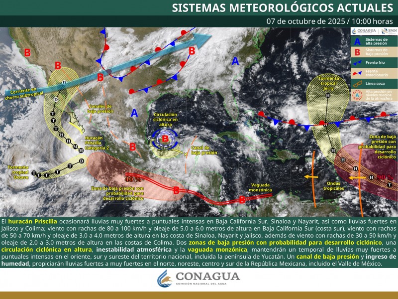 El huracán Priscilla se desplazará lentamente al oeste de Baja California Sur, su circulación y bandas nubosas mantendrán la probabilidad de chubascos y lluvias fuertes a muy fuertes, rachas de viento fuerte y oleaje de hasta 4.0 metros de altura en las costas de Baja California Sur, Sinaloa y Nayarit.