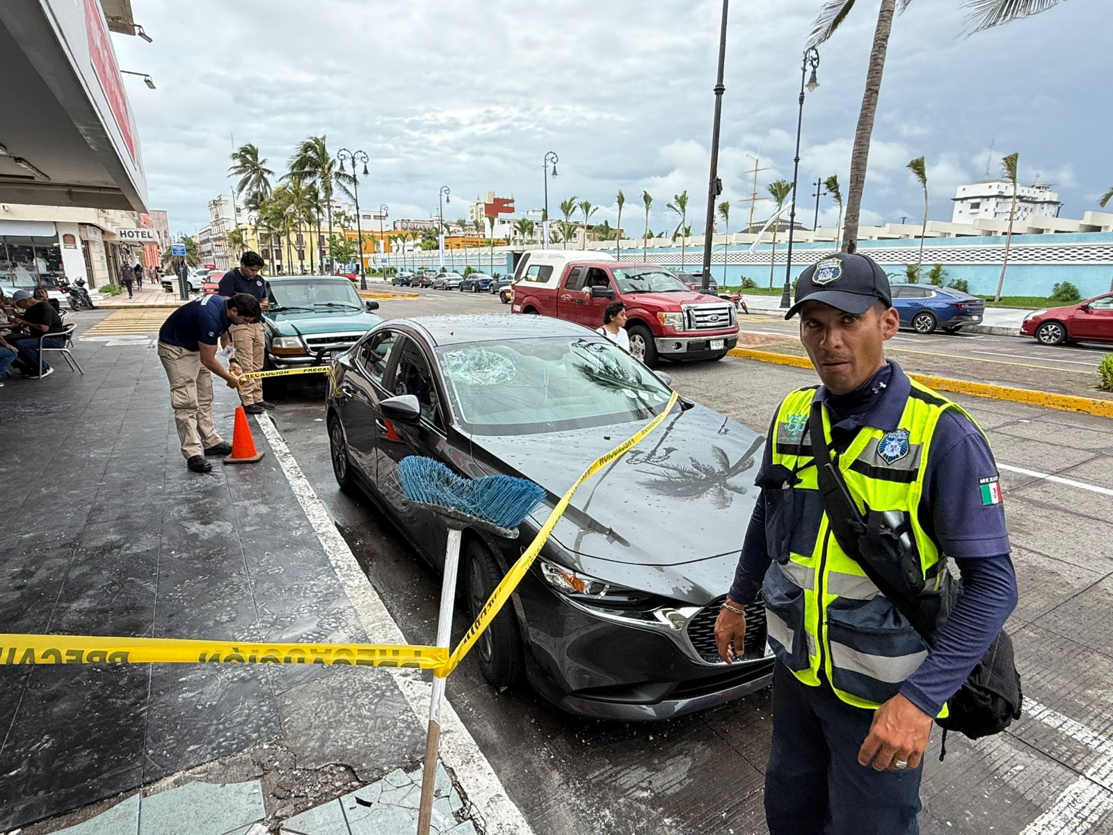 La caída de un fragmento de concreto del histórico Gran Café de la Parroquia provocó daños a un automóvil que se encontraba estacionado sobre la avenida Mario Molina, en el centro de Veracruz, frente al Mercado de Artesanías del Malecón.
