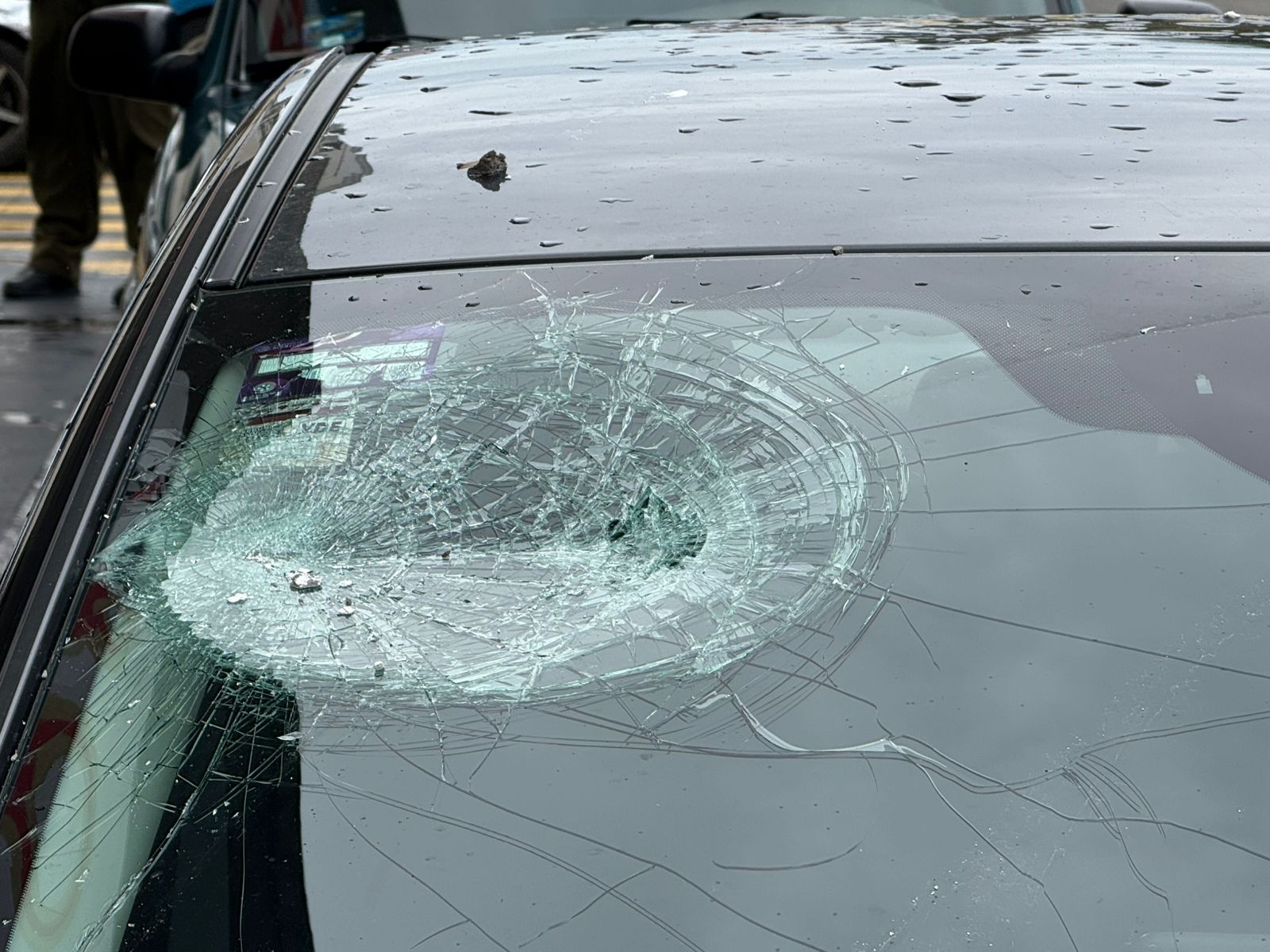 El pedazo de material cayó justo sobre un vehículo Mazda color gris que permanecía detenido en la zona y destrozó el parabrisas, además de dañar parte de la carrocería.