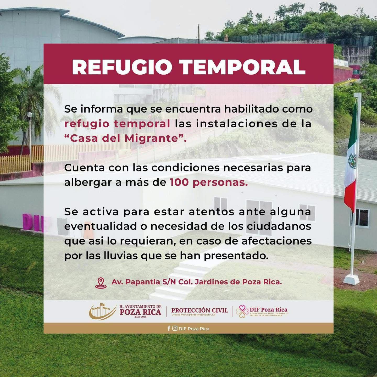 Ante las intensas lluvias registradas durante la noche y las que se prevén en los próximos días, el Sistema DIF Poza Rica, en coordinación con Protección Civil y el Ayuntamiento, informó que las instalaciones de la Casa del Migrante fueron habilitadas como refugio temporal para la población que lo requiera.