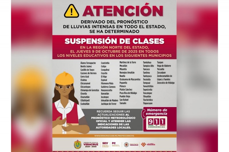 Como medida de continuidad y seguimiento a las acciones preventivas implementadas ante el temporal lluvioso, el Comité Estatal de Emergencias, en coordinación con la Secretaría de Educación, determinó mantener la suspensión de clases y labores de personal docente así como administrativo de centros escolares este jueves 09 de octubre en 58 municipios de la zona norte:
