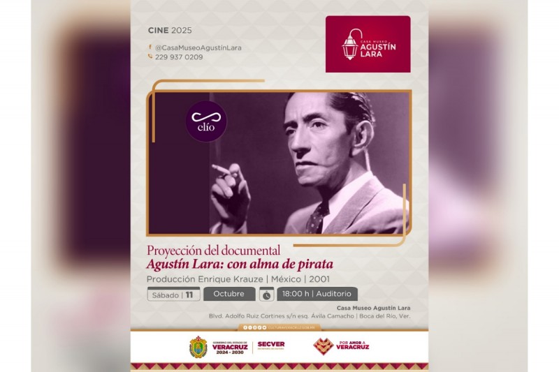 La Secretaría de Cultura de Veracruz invita a la proyección del documental Agustín Lara: Con alma de pirata (2001) que se realizará este sábado a las 18:00 horas, en el auditorio de la Casa Museo Agustín Lara. La entrada es gratuita con aforo limitado.