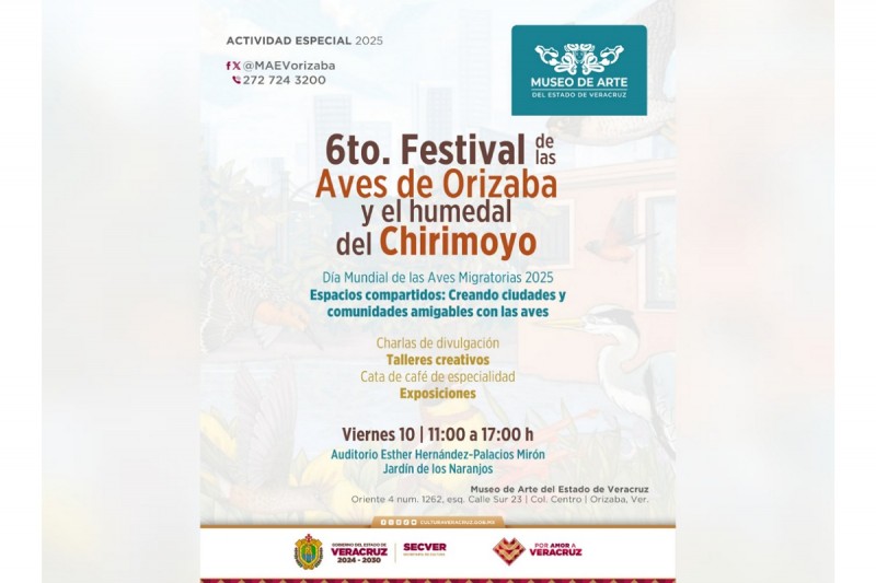 La Secretaría de Cultura de Veracruz invita a las actividades del Sexto festival de Aves de Orizaba y el Humedal del Chirimoyo que se realizarán en el Museo de Arte del Estado de Veracruz (MAEV) este viernes, en horario de 11:00 a 17:00 horas. La entrada es gratuita.