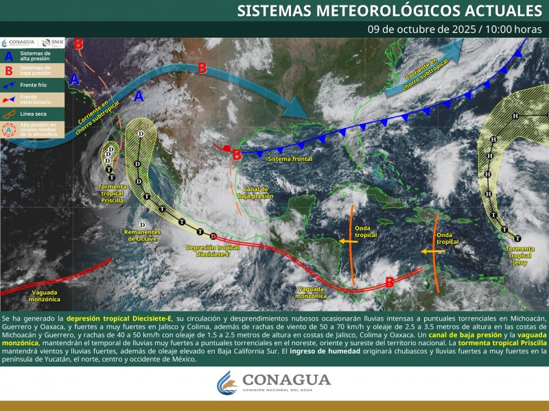 Por otro lado, los remanentes de Priscilla se localizarán frente a la costa occidental de Baja California Sur, ocasionando vientos y lluvias fuertes, además de oleaje elevado en dicha entidad.