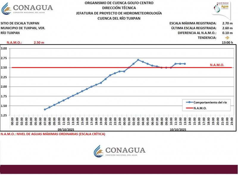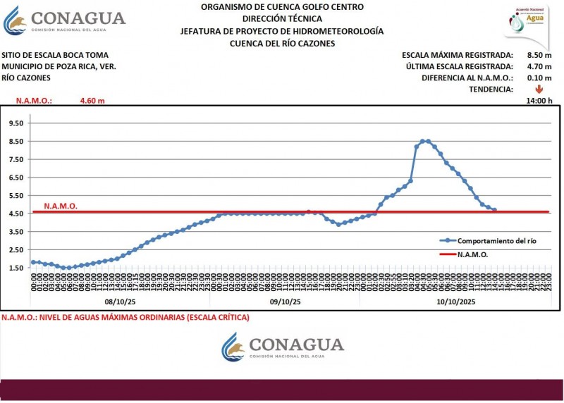 Según el análisis de la especialista, a las 2:00 de la mañana de este viernes, el Río Cazones se encontraba justo en su Nivel de Aguas Máximas Ordinarias (N.A.M.O.). Sin embargo, la situación se salió de control en cuestión de horas.