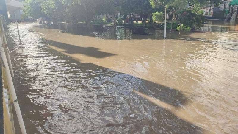 La explanada del Palacio Municipal, el parque central y el mercado municipal —ubicado en el barrio Zona Centro, Alto Lucero y El Paraíso— se encuentran completamente cubiertos de agua, dificultando el tránsito y las actividades comerciales.