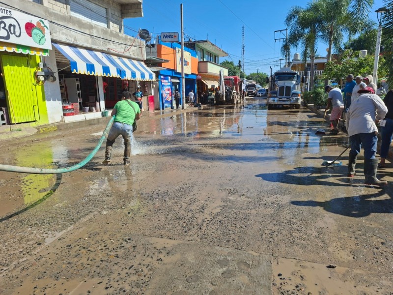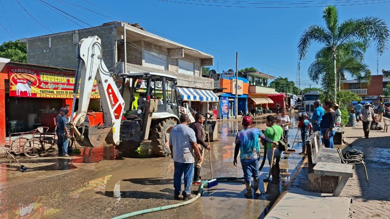 Con apoyo de una máquina retroexcavadora y pipas con agua, también se están lavando las principales calles y domicilios del centro de la cabecera municipal. Estas acciones buscan evitar problemas sanitarios y contribuir a una pronta recuperación de la zona.