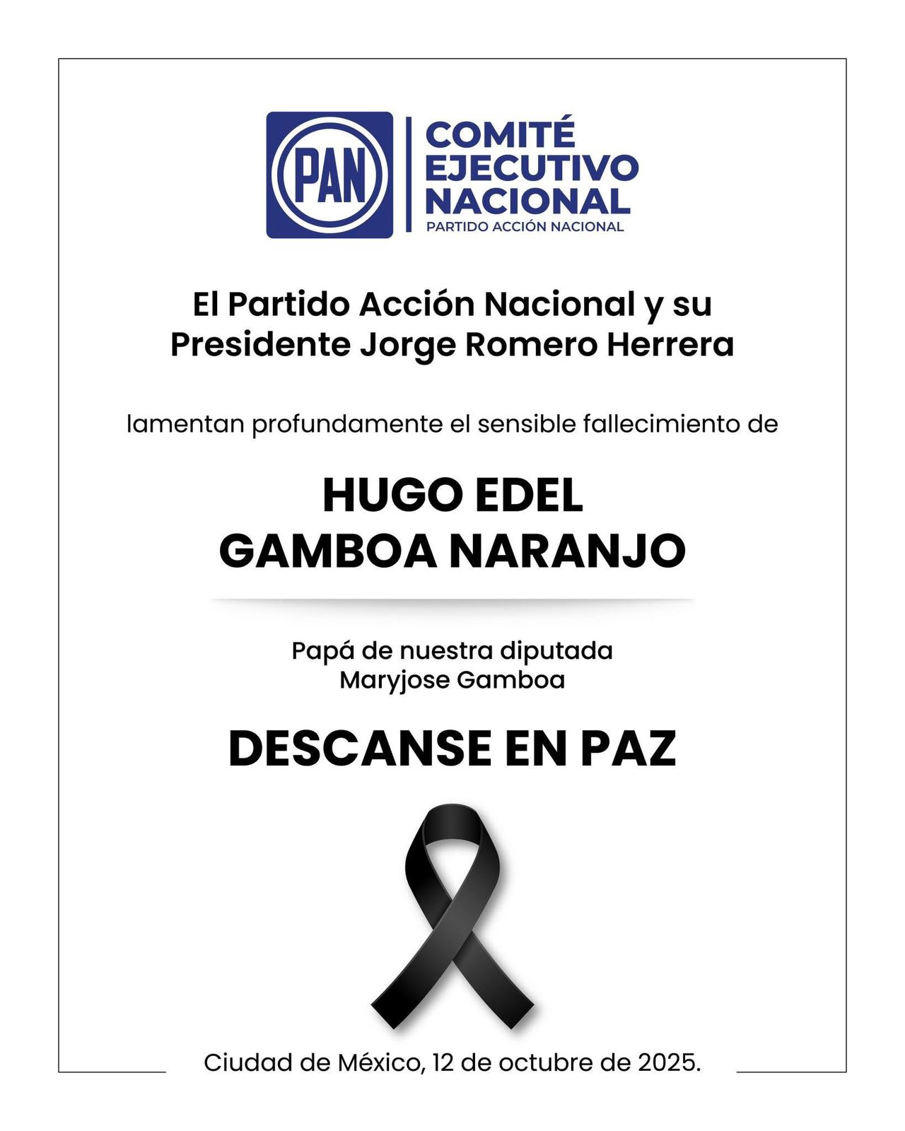 “Con profundo pesar, acompaño a nuestra querida diputada Maryjose Gamboa por la pérdida de su padre, el señor Hugo Edel Gamboa Naranjo”, expresó Jorge Romero.