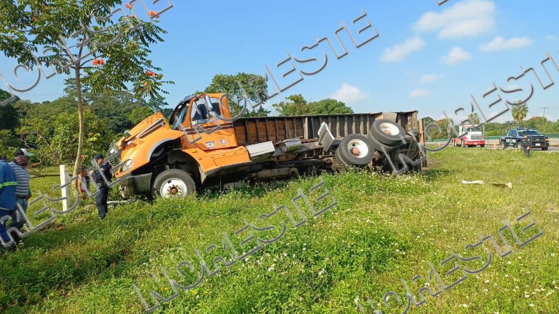 De acuerdo con informes preliminares, el operador del vehículo perdió el control al tomar una curva, lo que provocó que la unidad saliera del camino y terminara volcada sobre el área verde contigua a la carretera, cerca del entronque de Rancho Trejo.
