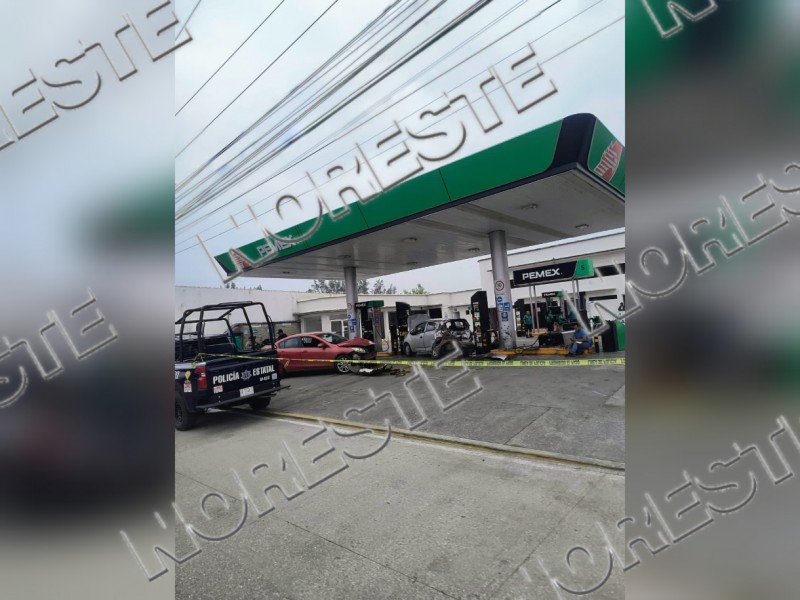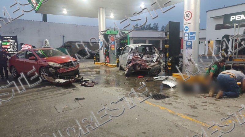 De acuerdo con testigos, el vehículo color rojo que se desplazaba con dirección hacia Las Bajadas ingresó de forma repentina a la estación de servicio e impactó contra un auto gris que en ese momento cargaba gasolina, derribando incluso una de las bombas.