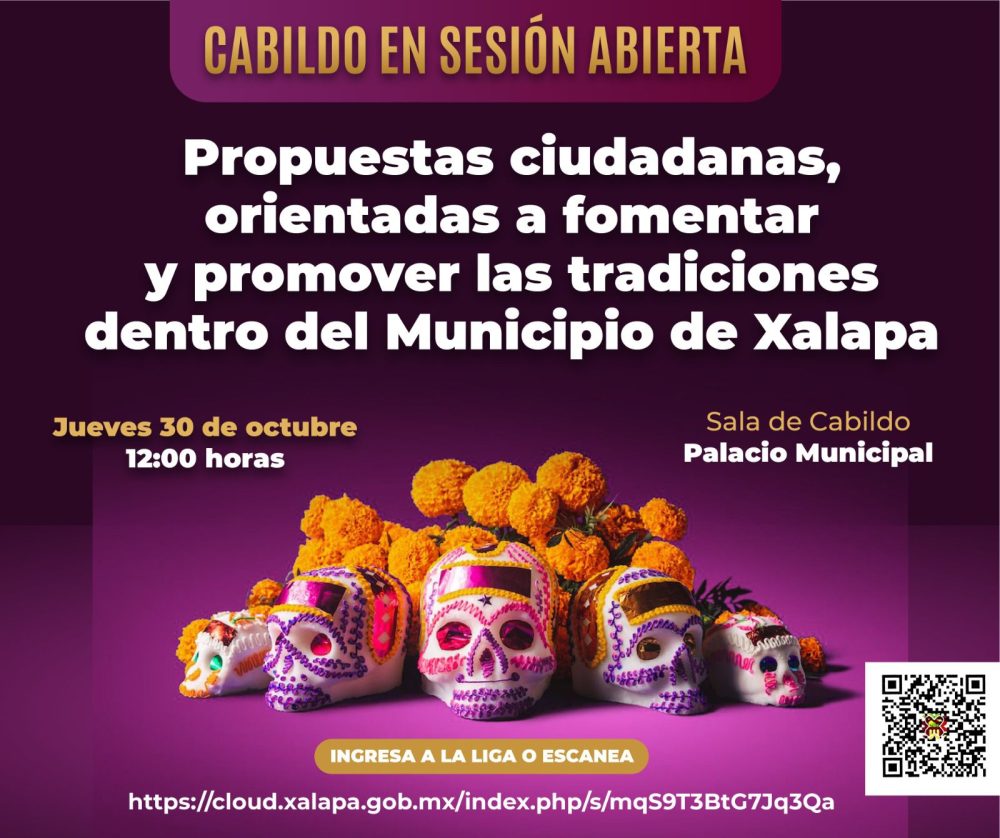 Con el propósito de recibir, escuchar y analizar propuestas ciudadanas orientadas a fomentar y promover las tradiciones en el municipio de Xalapa, el próximo jueves 30 de octubre, a las 12:00 horas, se realizará el quinto Cabildo en Sesión Abierta del año, por lo que se invita a la ciudadanía a participar y presentar sus iniciativas en la materia.