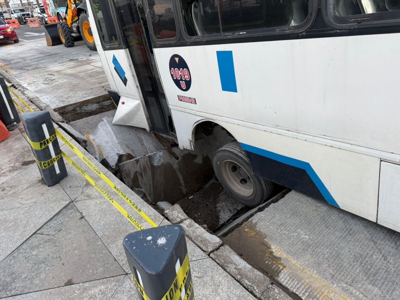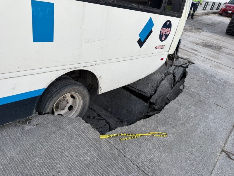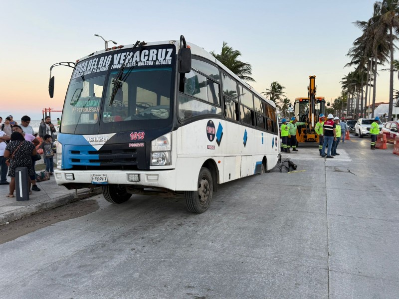 El vehículo de la ruta Boca del Río, con número económico 1019, cayó por la parte de atrás, cuando el piso se abrió a su paso, dejando la mitad de la estructura sumergida.