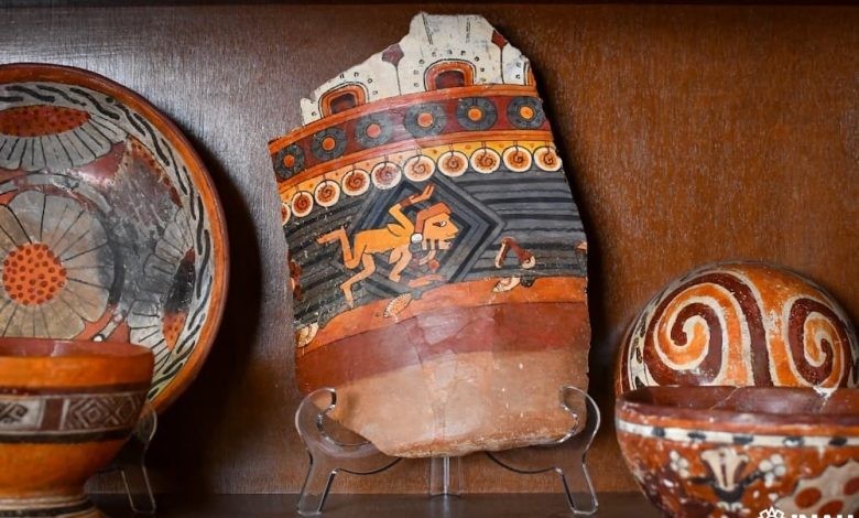 Esta representación no es casual. El investigador señaló que tanto en el fragmento cerámico como en el mural, la mujer luce el cabello largo, adornos que denotan nobleza, y su entorno acuático sugiere purificación y limpieza.
