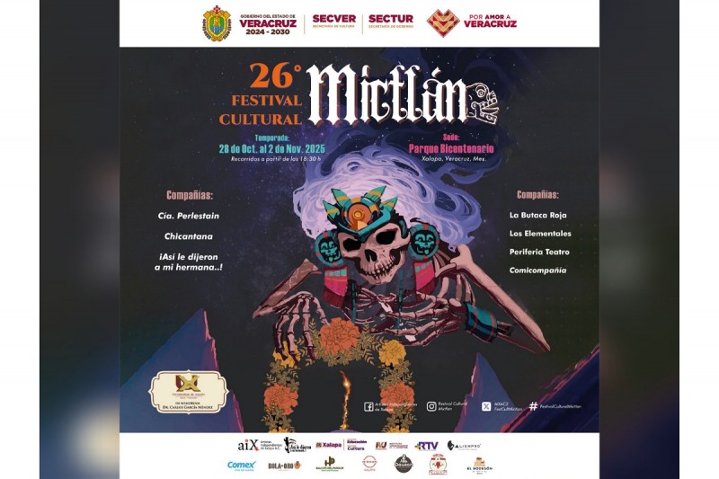 La Secretaría de Cultura de Veracruz (SECVER), en coordinación con la Asociación de Artistas Independientes de Xalapa AIX A.C., el Ayuntamiento de Xalapa, el Instituto Veracruzano de la Juventud, Radiotelevisión de Veracruz, así como la iniciativa privada, enaltece y preservar las tradiciones de la región capital como el 26° Festival Cultural Mictlán que se llevará a cabo del martes 28 de octubre al domingo 2 de noviembre de 2025.