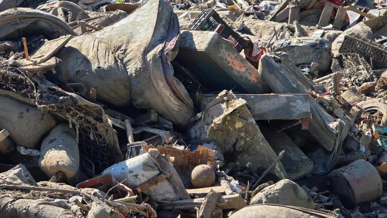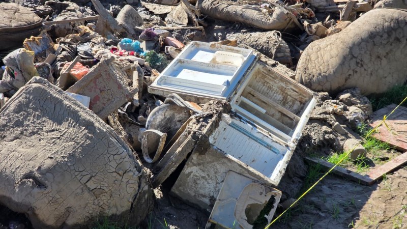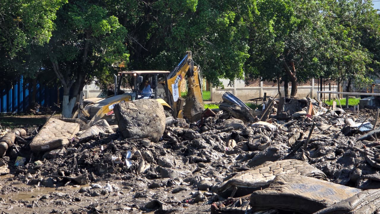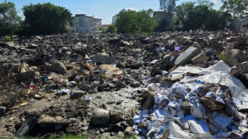 En la unidad deportiva se acumulan toneladas de residuos, entre ellos electrodomésticos, refrigeradores, muebles, papelería y grandes cantidades de lodo que fueron arrastrados por la corriente. Las labores de limpieza y saneamiento continúan en distintas colonias, lo que ha incrementado el flujo de desechos hacia este punto.