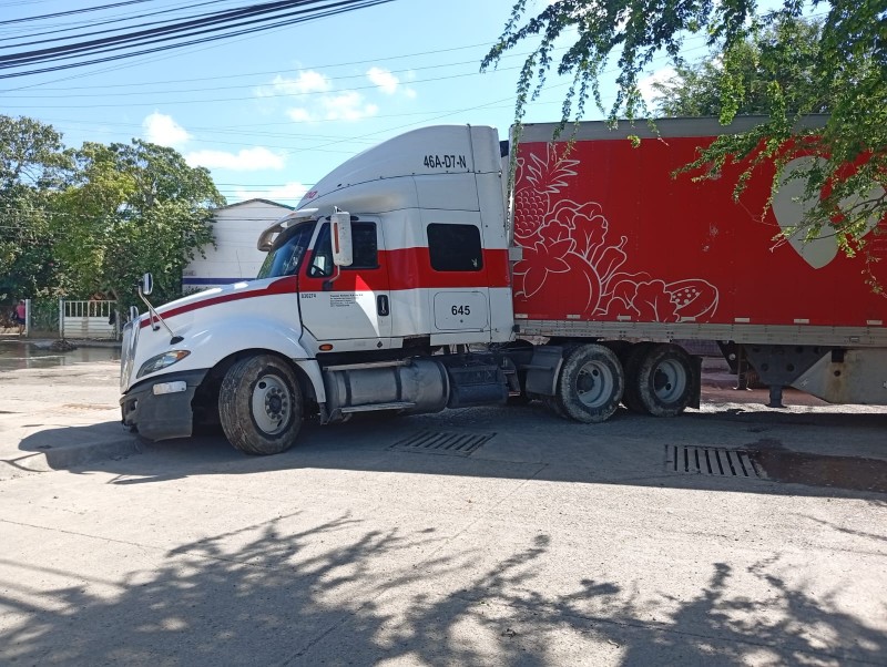 El incidente se registró la tarde de este viernes, cuando el conductor realizaba maniobras de reversa tras haber entregado mercancía en la tienda. De manera repentina, la rejilla de la alcantarilla cedió y una de las llantas delanteras del tractocamión quedó hundida en el pavimento.