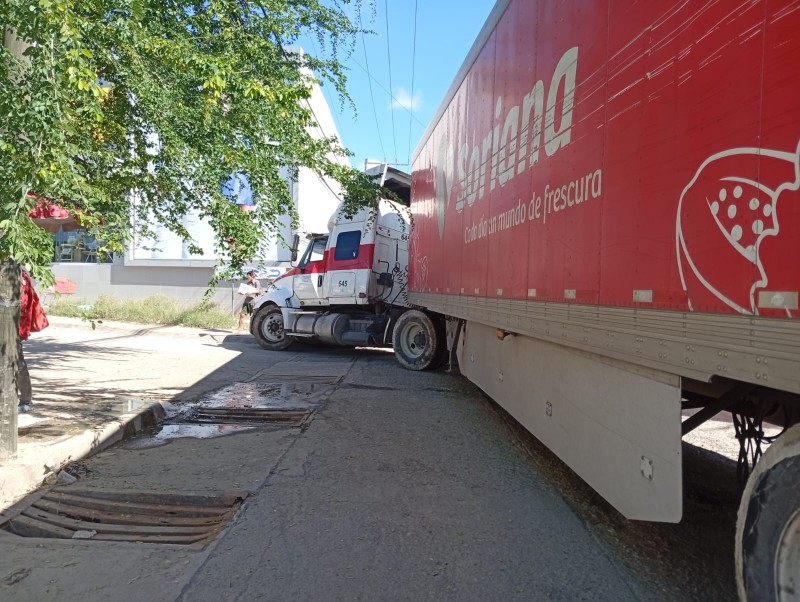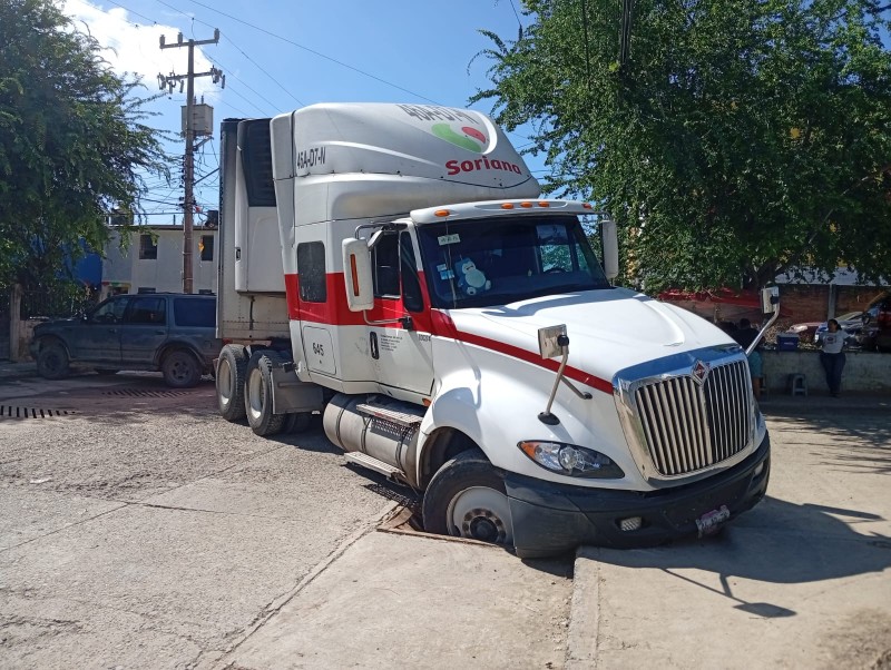 Un tráiler de la empresa Soriana quedó varado luego de que una de las alcantarillas del Infonavit CANACO colapsara bajo su peso, generando una fuerte movilización y causando el cierre de la calle 15 de Julio.