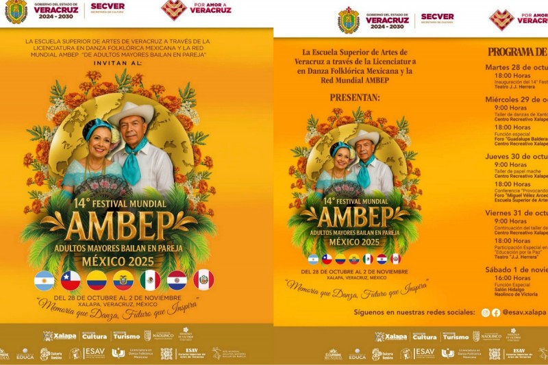 La Secretaría de Cultura de Veracruz (SECVER), en coordinación con la Escuela Superior de Artes de Veracruz (ESAV), el Ayuntamiento de Xalapa y el Ayuntamiento de Naolinco, invita a las actividades del 14º Festival Mundial AMBEP “Adultos Mayores Bailan en Pareja” que se llevará a cabo del martes 28 al domingo 2 de noviembre.