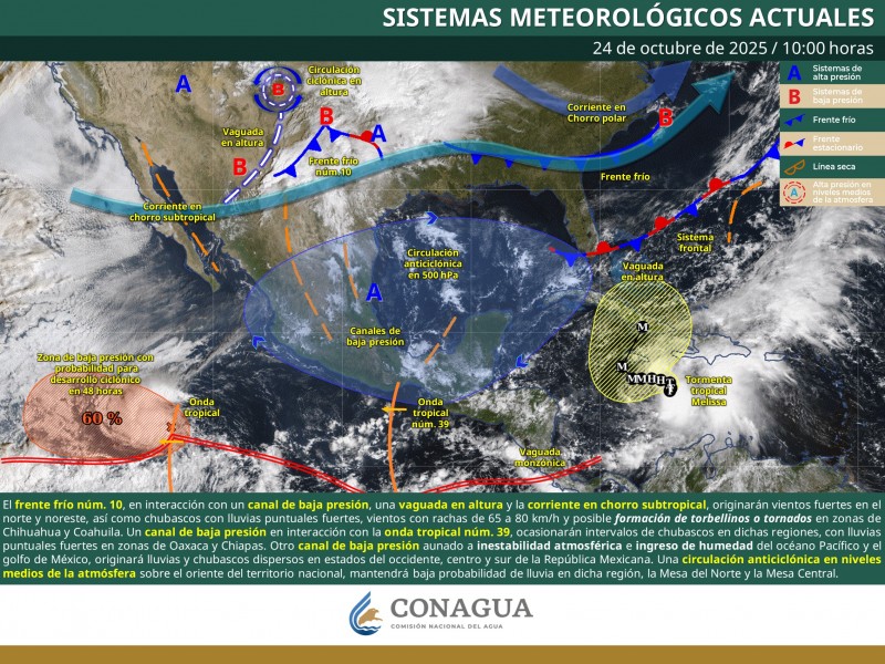 El frente frío núm. 10 recorrerá gradualmente el norte y noreste de México, en interacción con una vaguada en altura y la corriente en chorro subtropical, generará vientos fuertes en dichas regiones, pronosticándose vientos con rachas de 55 a 70 km/h y posible formación de torbellinos en zonas de Coahuila y Nuevo León.
