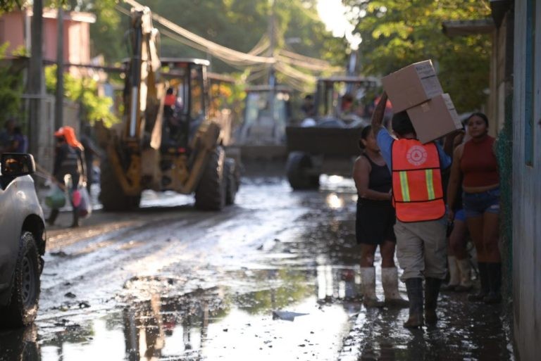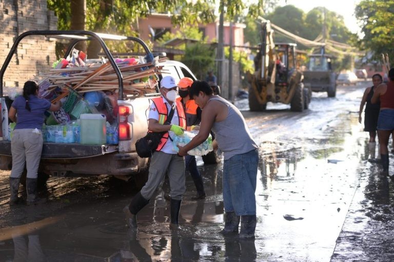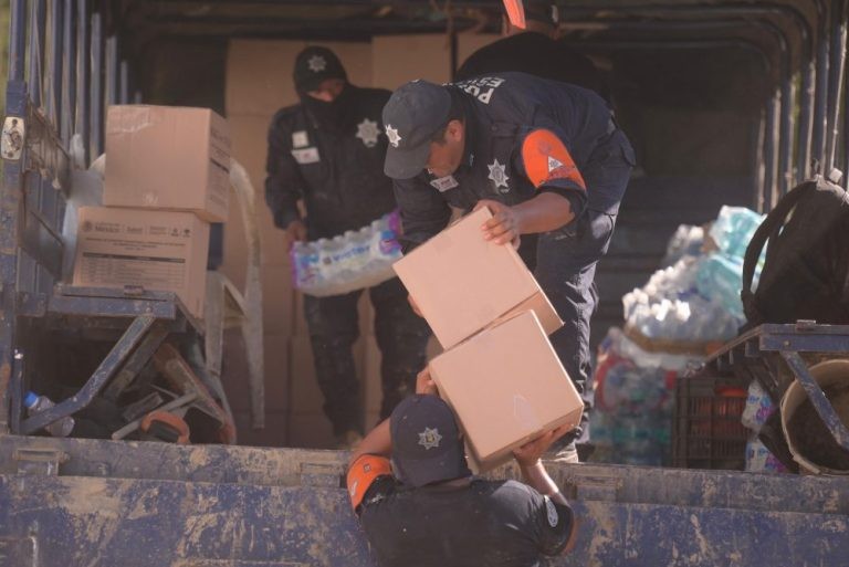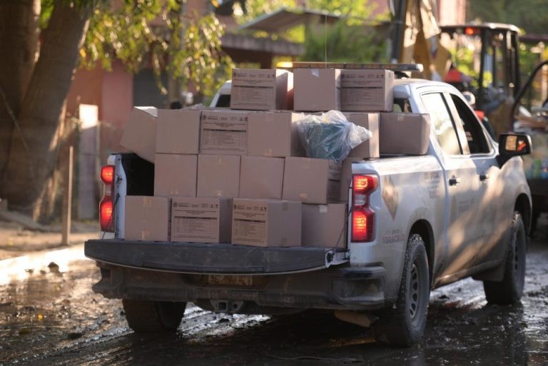 En la bodega de resguardo de insumos, verificó el avance en la entrega de paquetes alimentarios, agua y productos de limpieza, e instruyó a las brigadas a continuar la distribución casa por casa; desde este punto partieron unidades con 527 paquetes alimenticios, 633 litros de agua purificada y 15 galones de desinfectante de 20 litros cada uno, destinados a los hogares más afectados.