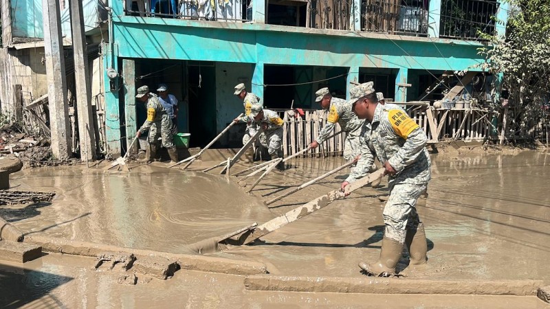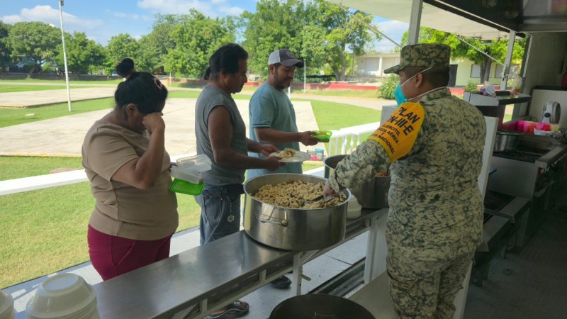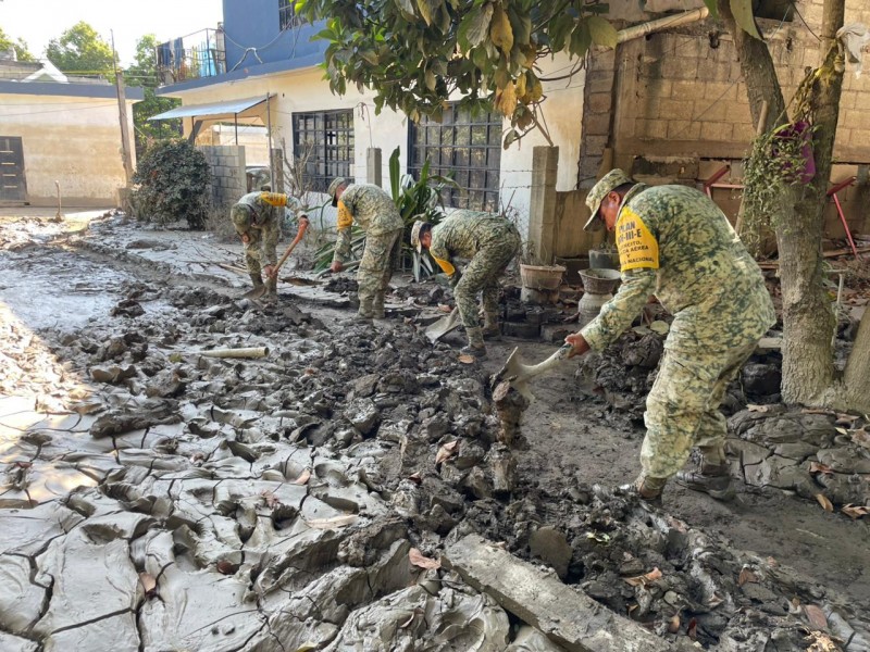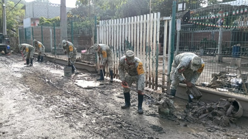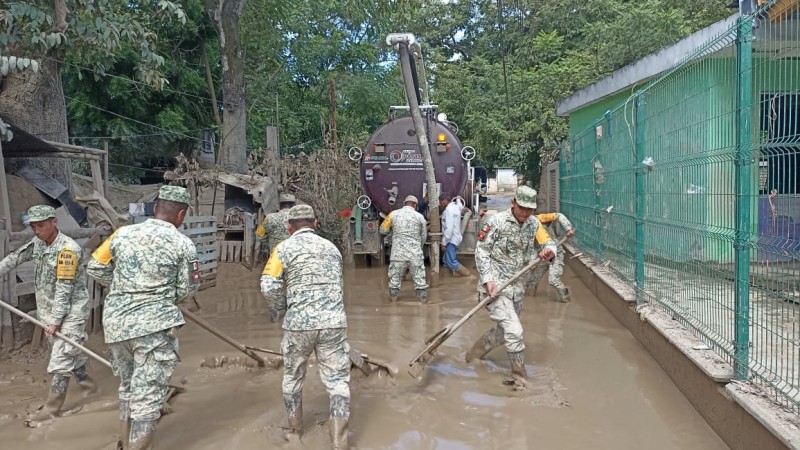 Dentro de las actividades realizadas, el personal militar efectuó labores de desasolve y limpieza en la Colonia Los Cuiches, beneficiando directamente a cinco viviendas, así como en el Jardín de Niños “Acela Servín Murrieta”, logrando su rehabilitación total al 100%.