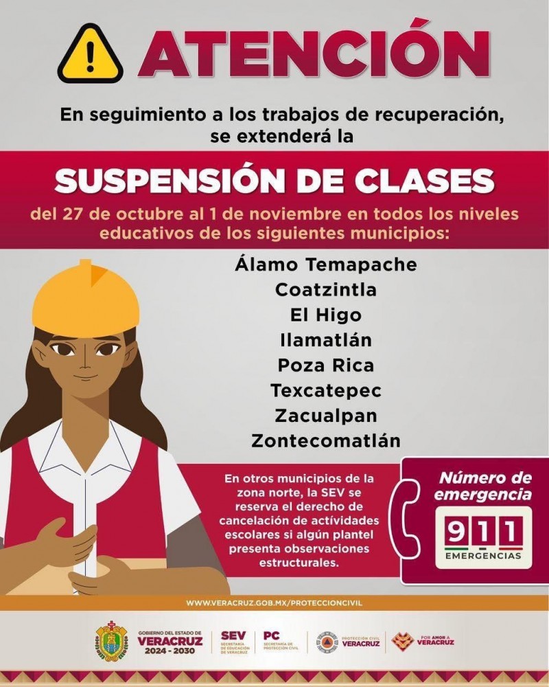 La suspensión de actividades escolares, contempla Poza Rica, Álamo, Coatzintla , entre otros municipios del sur, esto por los trabajos de recuperación que continúan de las familias afectadas por la pasada inundación.