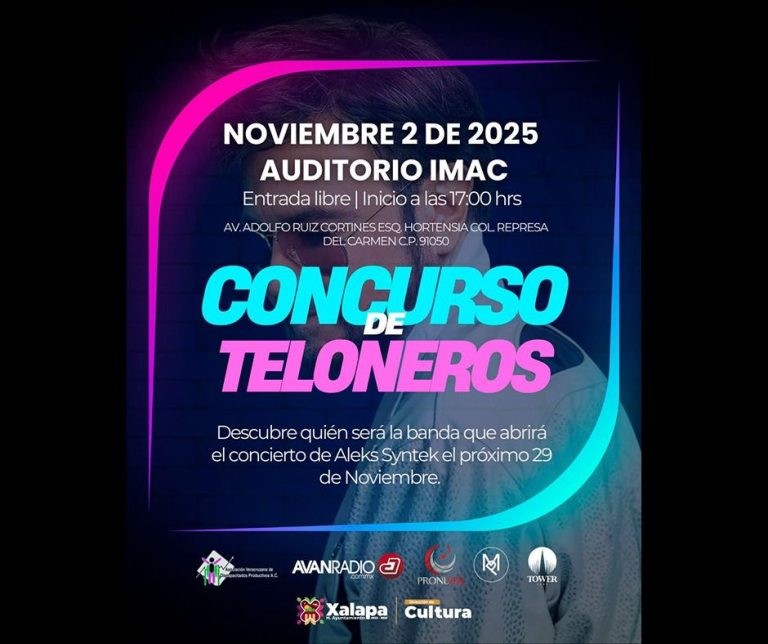 A las 17:00 horas, en el auditorio de la IMAC, se tendrá un concurso de teloneros para elegir a la banda que abrirá el concierto de Alex Syntek el próximo 29 de noviembre.